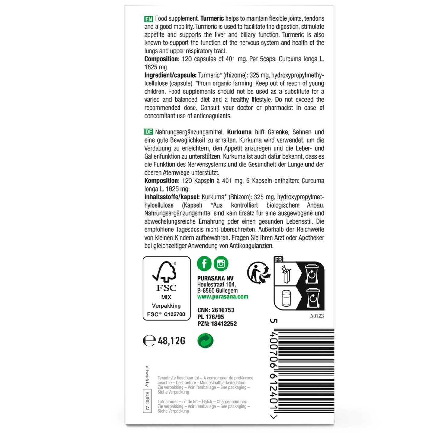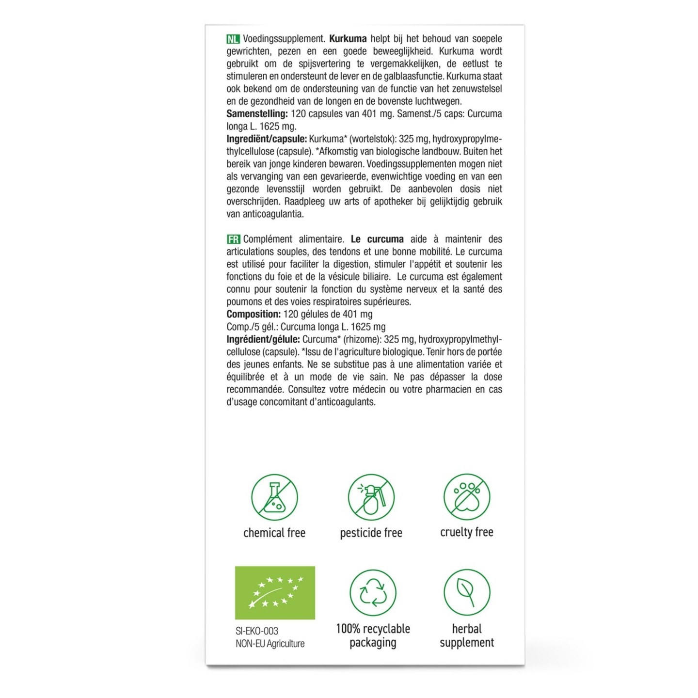 Curcuma* (rhizome, Inde) : 325 mg, hydroxypropylméthylcellulose (capsule)