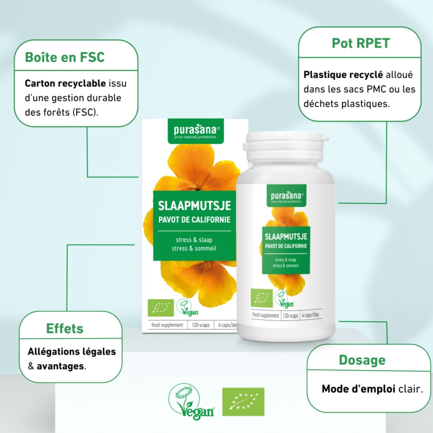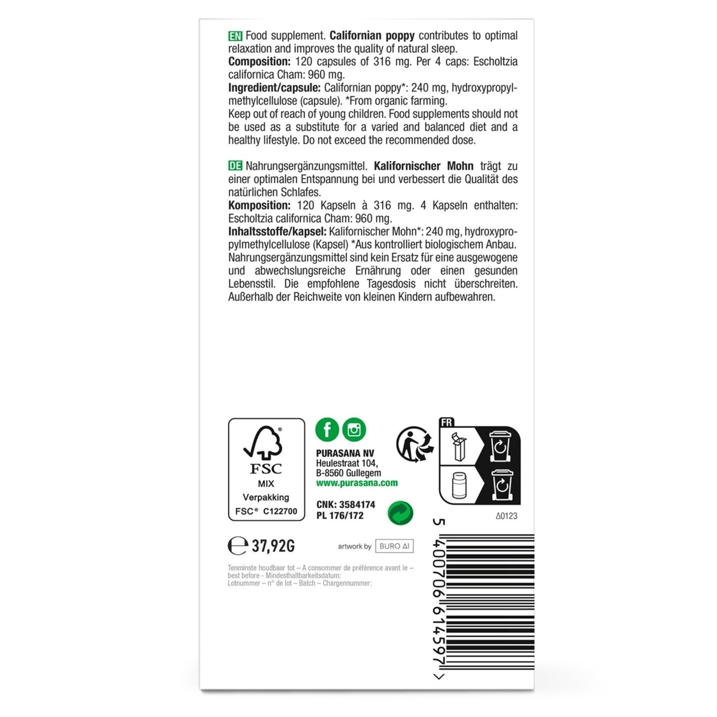 Pavot de californie (Escholtzia) Bio - 240 mg - 120 gélules - Purasana
