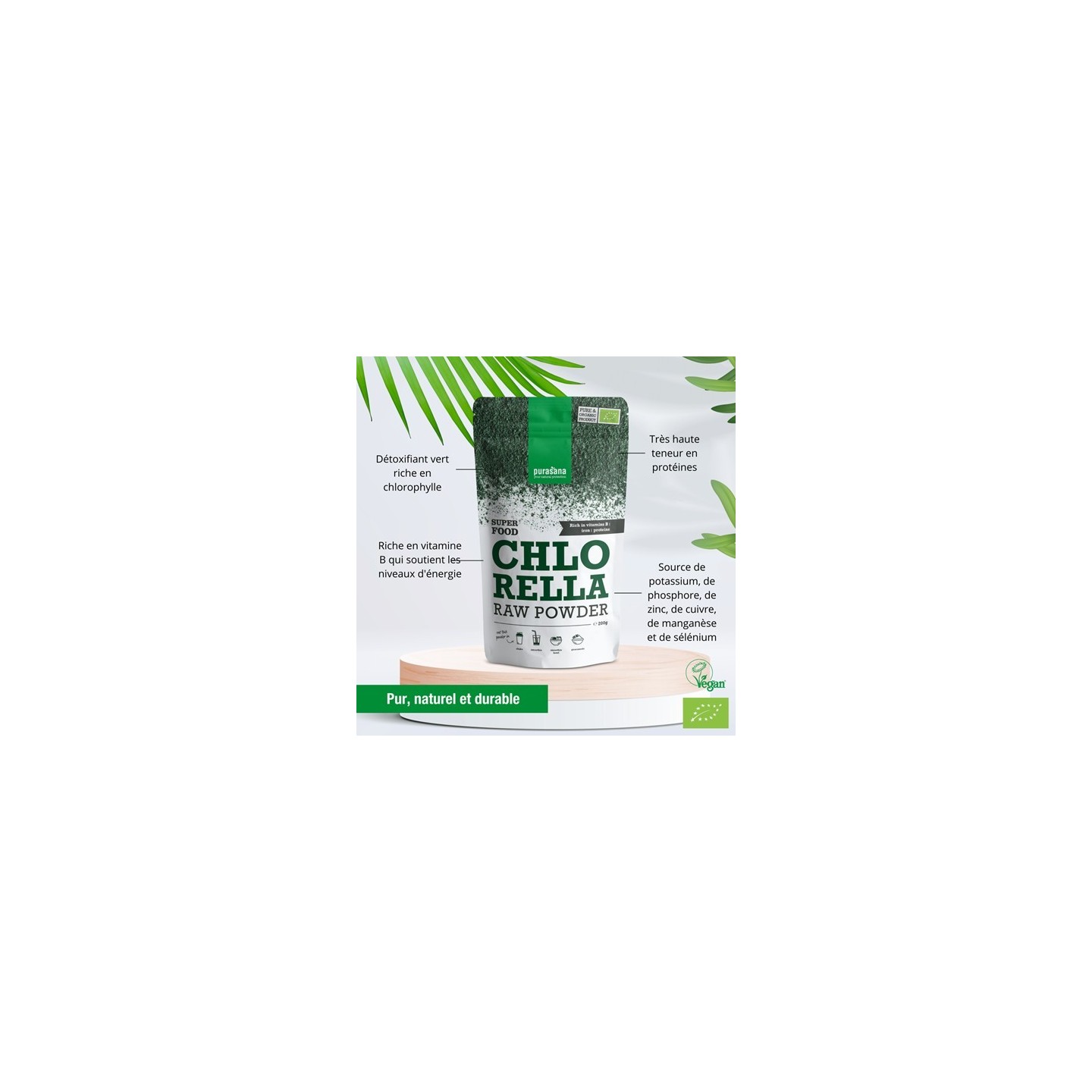 Purasana chlorella poudre contient 100 % de chlorelle cru, sans aucun additif supplémentaire. Le produit est certifié biologique, végétalien et casher, il est également exempt d'allergènes tels que le gluten, le lactose et le soja.