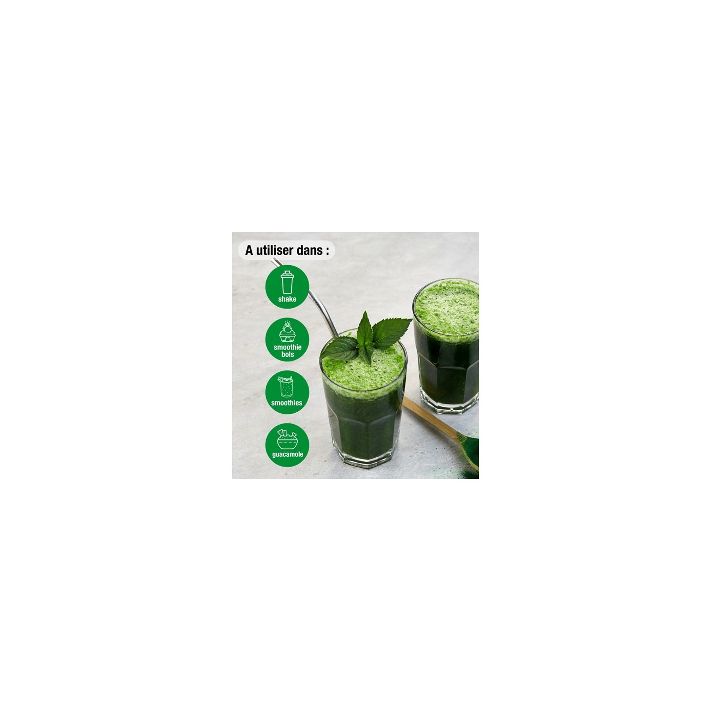 Ajoutez 6 g de chlorella poudre à 300 ml de jus, de boisson de riz ou d'avoine.
