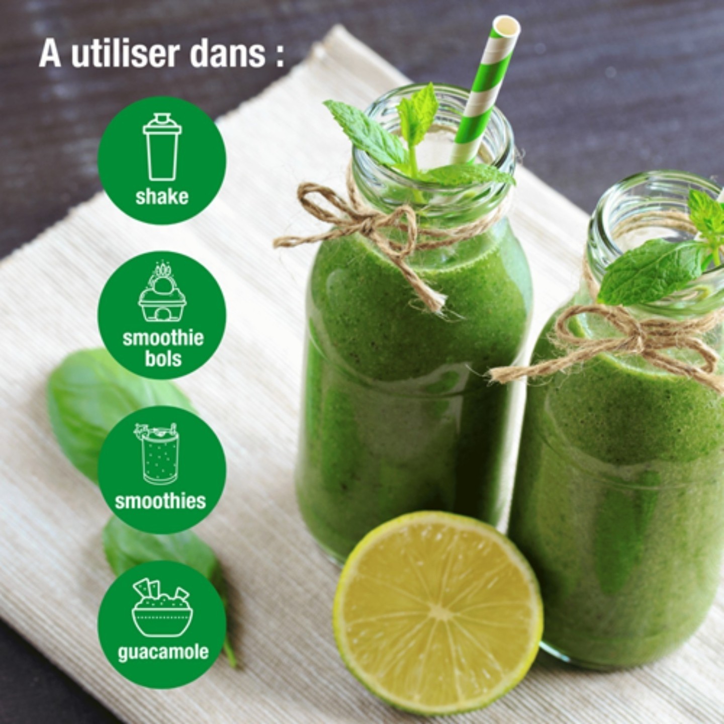 Envie d’innover ? Sa couleur intense et sa saveur végétale apportent une touche originale à vos smoothies, bowls ou même à votre guacamole.