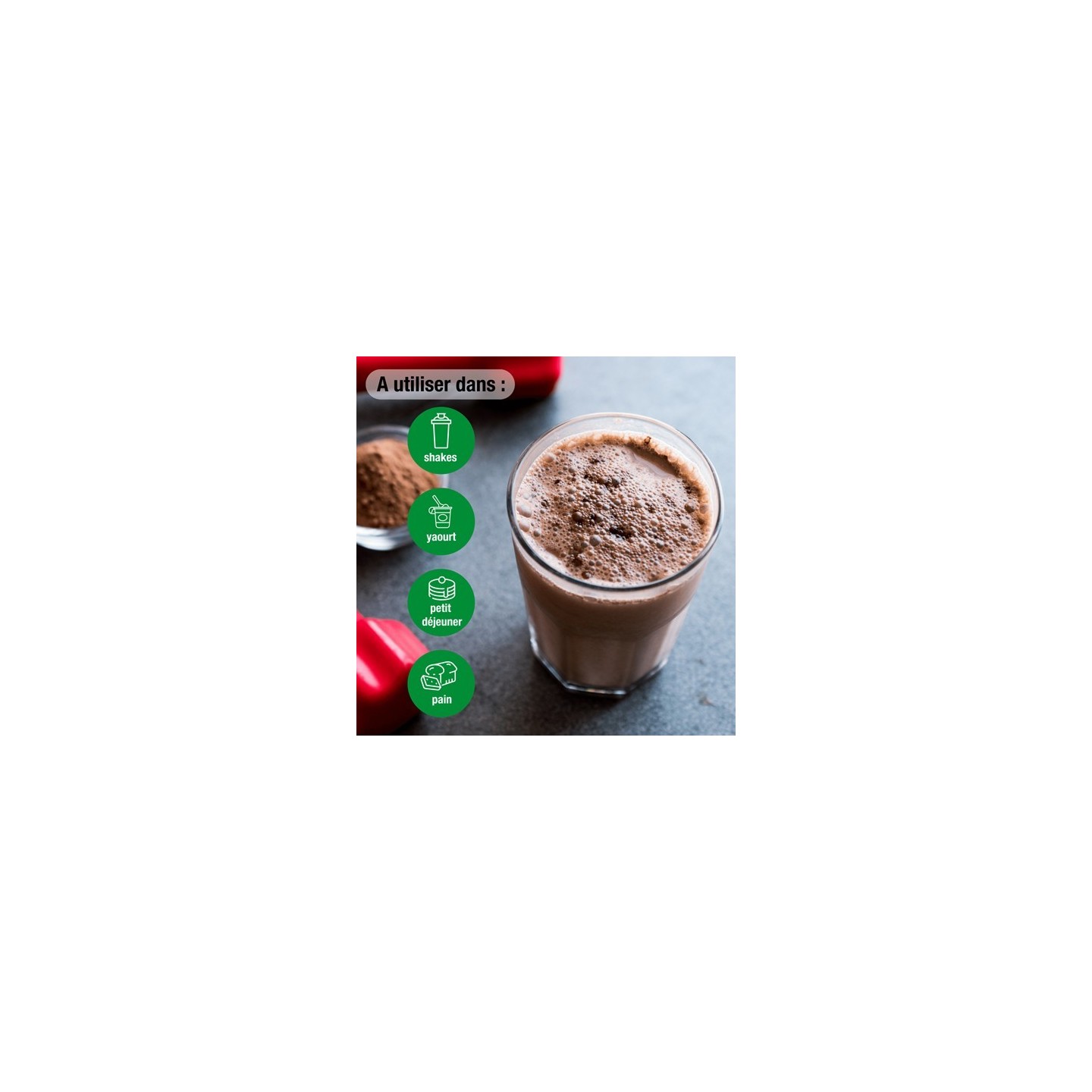 Pour un boost protéiné le matin, ajoutez 1 ½ cuillère-dose de Whey Cacao à 300-350 ml de lait de riz ou de soja, de shakes, de smoothies ou de céréales.