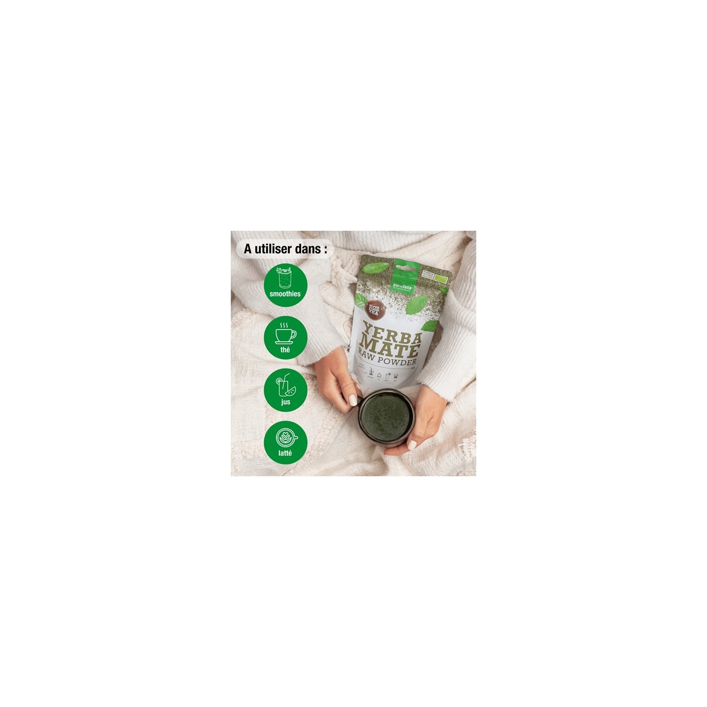 100 % poudre de yerba maté (Ilex paraguariensis) pur et bio provenant d'Amérique du Sud.
