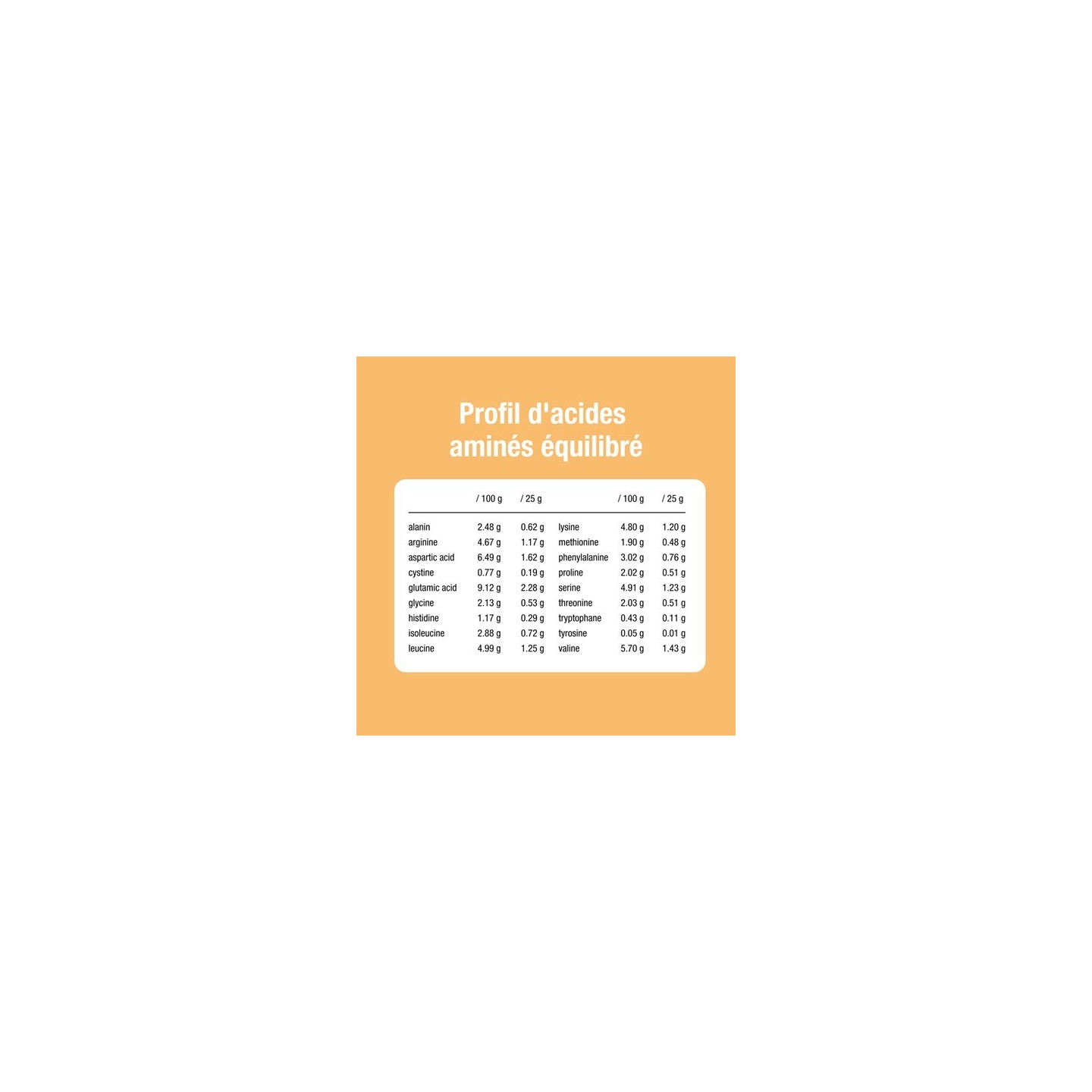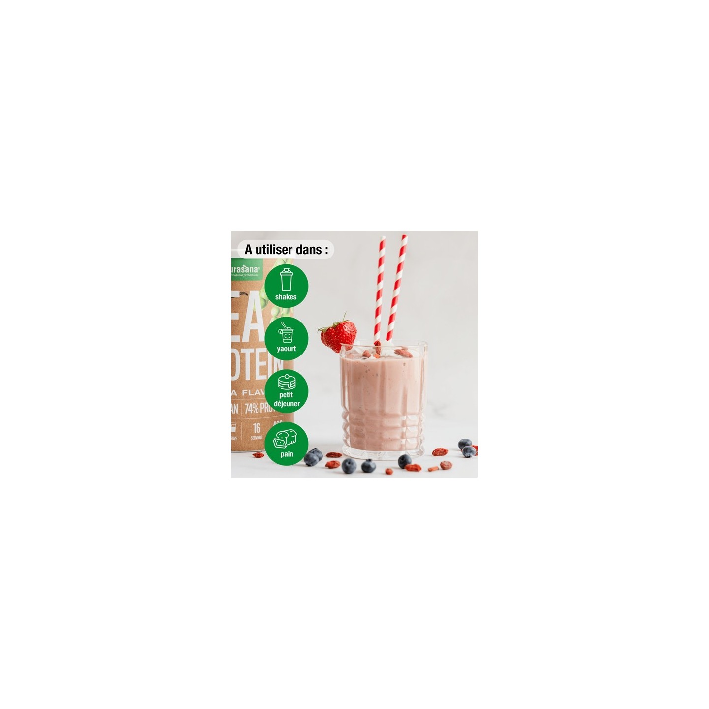 - 74 % de protéines provenant de la poudre de protéines de pois